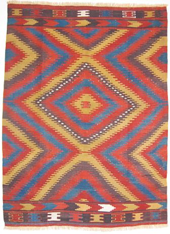 The design of this small kilim is composed of concentric diamond medallions, each with serrated edges that elicit attention. This rare design type is known to have come from Afyon, northwest of Konya. Early examples such as this use clear dyes made from the madder root to create three different colors: red, orange, and aubergine purple. The stable yellow dye is particularly glowing and the indigo blue changes from lighter to deeper tones. This abrash, the slight variations in tone that result when the weaver uses different dye batches, lends additional character to the piece. Details of white cotton—the small central ones are brocaded—add a playful punctuation. The design of later weavings remains true to this configuration, but the dyes become somber and dull.
