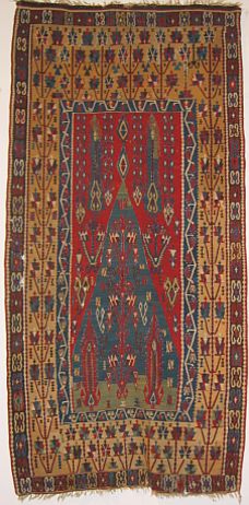 The central panel of this dramatic kilim is shaped by a steeply sloping arch that terminates at its apex in two appended diamonds. An archaic, branching tree is aligned along the central axis, its angular stems tipped by flower heads. Two large, spiky forms within the niche evoke cypress motifs and are repeated in each spandrel above the arch. A graphic border in golden yellow displays a design frequently found in this group of weavings: a single stiff stem supporting a series of blossoms arranged in pairs. These exhibit a rudimentary segmented style typically used to depict carnations, one of the favored Ottoman flowers.