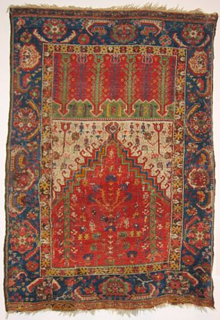 The structure, design, and selection of sparkling dyes suggest that this prayer rug was made in a region of west central Anatolia and was influenced by weavings from Gordes, Ushak, Ladik, and Dazgir.