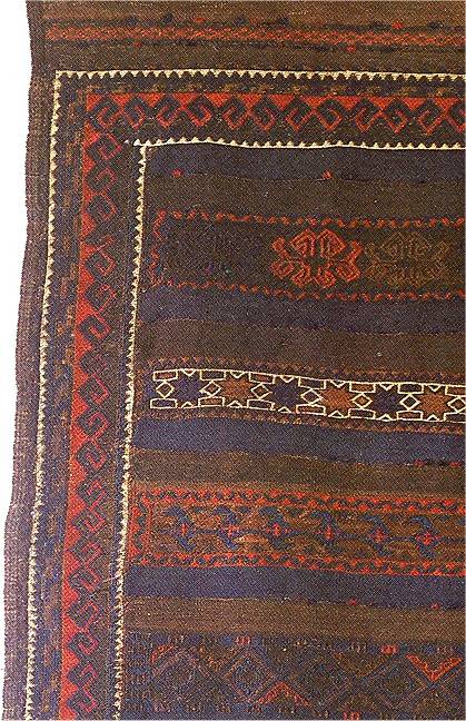 But notice that the green does not seem to clash particularly with the colors in the rest of the rug. Some might argue that the unpleasantness experienced with the Balouch piece immediately preceding this one is absent here.